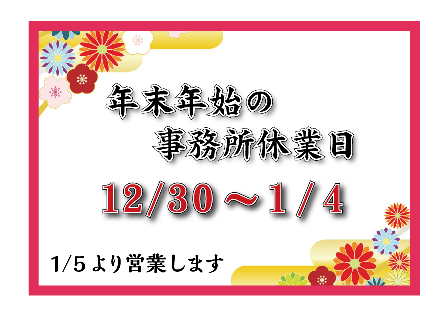 年末12/30より新年1/4まで事務所休業日とさせていただきます。