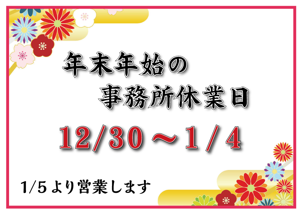 年末12/30より新年1/4まで事務所休業日とさせていただきます。